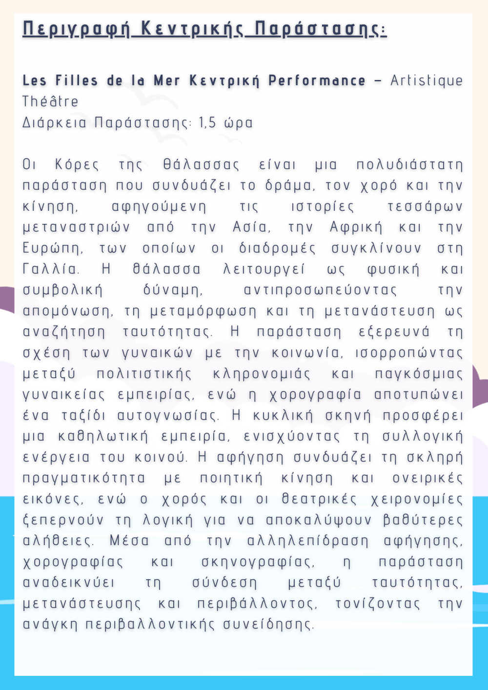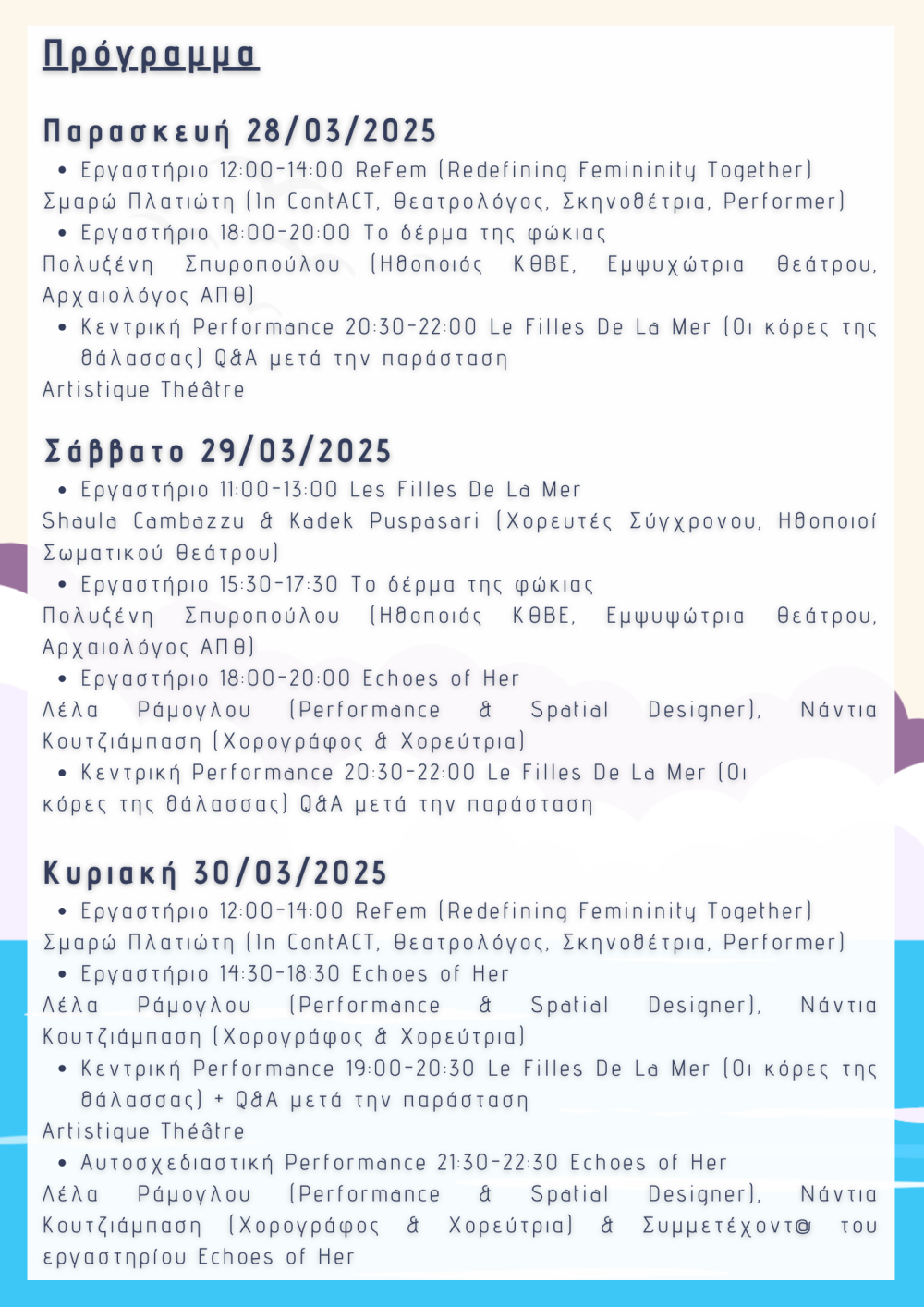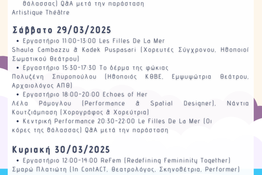 - "Echoes of Her" – Ένα εργαστήριο που συνδυάζει θέατρο, κίνηση και σκηνικές κατασκευές, οδηγώντας σε μια πειραματική performance που αποτυπώνει τη σύγχρονη γυναικεία ταυτότητα.