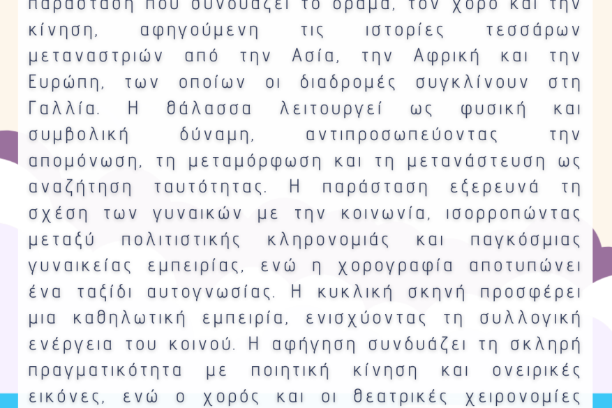 Η φετινή έκδοση του La Nomad House εστιάζει στη γυναικεία εμπειρία και τη μετανάστευση μέσα από την τέχνη, με επίκεντρο την κεντρική παράσταση/performance "Les Filles de la Mer" (Οι Κόρες της Θάλασσας) του γαλλικού θεάτρου Artistique Théâtre (Παρίσι). Πρόκειται για μια πολυδιάστατη θεατρική παραγωγή που συνδυάζει το δράμα, τον χορό και την κίνηση, αφηγούμενη τις διαδρομές τεσσάρων γυναικών από διαφορετικά μέρη του κόσμου, οι οποίες συναντιούνται στη Γαλλία. Μέσα από τη σκηνική της σύνθεση, η παράσταση διερευνά την έννοια της απομόνωσης και της μετάβασης, αναδεικνύοντας το σώμα ως φορέα πολιτισμού και μαρτυρίας.
