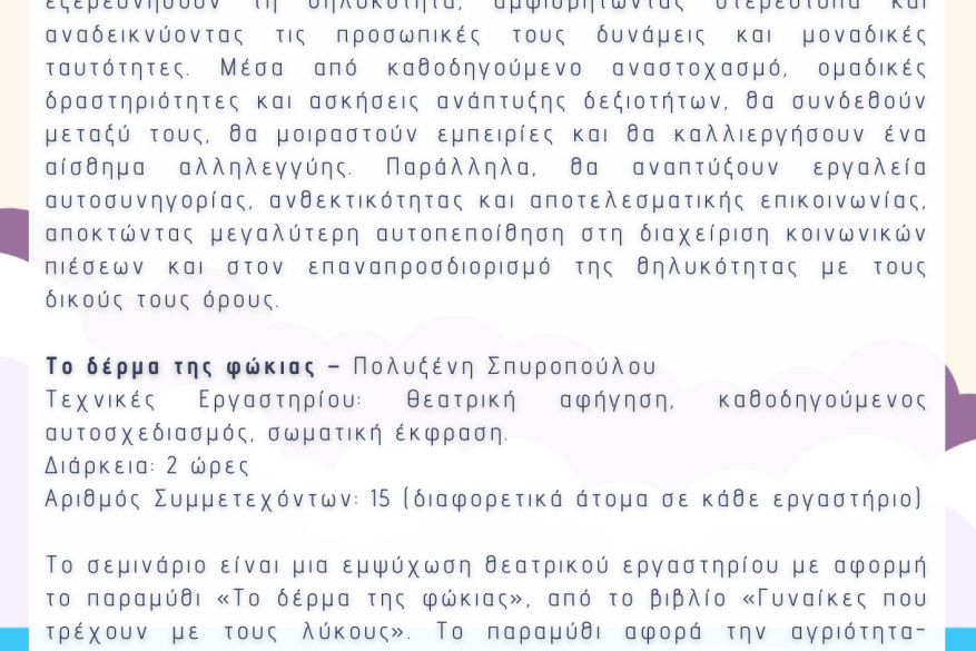 - "Το Δέρμα της Φώκιας" – Ένα θεατρικό εργαστήριο εμπνευσμένο από το βιβλίο "Γυναίκες που Τρέχουν με τους Λύκους", το οποίο εστιάζει στην ελευθερία και την αυθεντικότητα της γυναικείας φύσης.