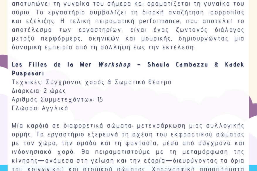 - "Les Filles de la Mer" Workshop – Ένα χοροθεατρικό εργαστήριο (συμπληρωματικό της κεντρικής παράστασης) που εξερευνά τη σχέση του σώματος με τον χώρο, την ομάδα και τη φαντασία, μέσα από σύγχρονο και ινδονησιακό χορό.