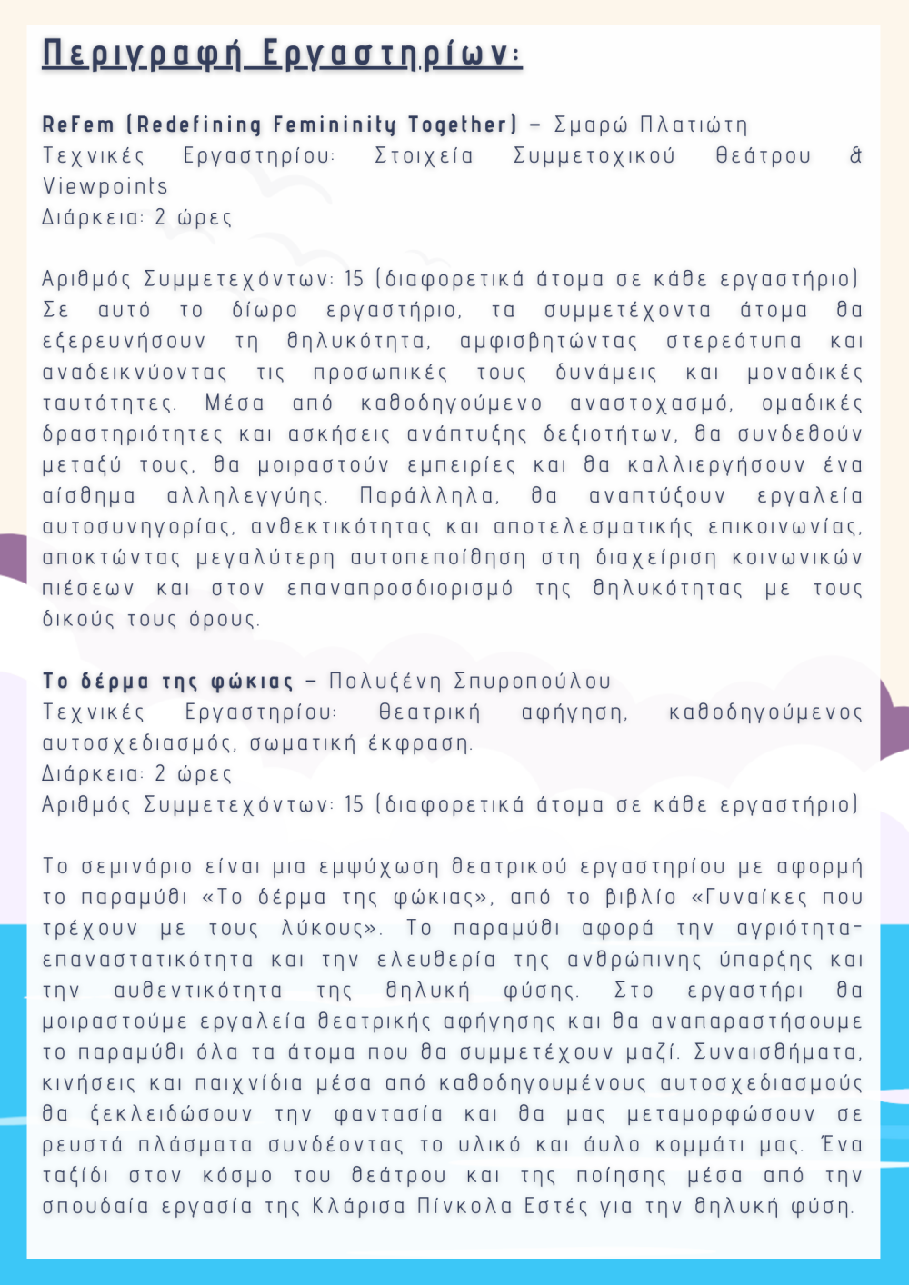 - "ReFem" (Redefining Femininity Together) – Ένα βιωματικό εργαστήριο που επαναπροσδιορίζει τη θηλυκότητα μέσα από στοιχεία συμμετοχικού θεάτρου και Viewpoints.